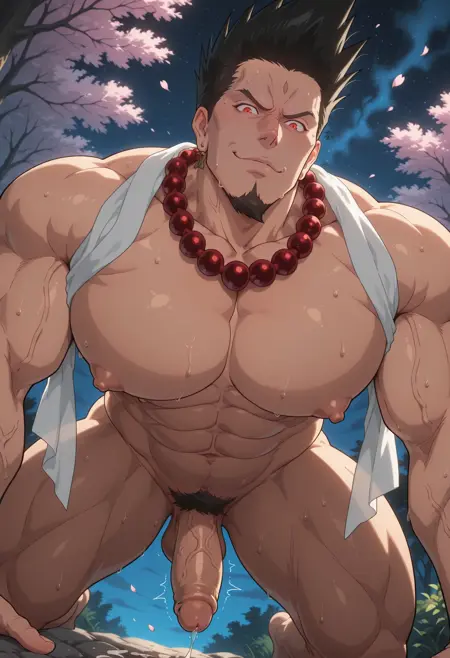 Black hair, Towering spiked hair, red eyes, goatee, red dot on forehead,