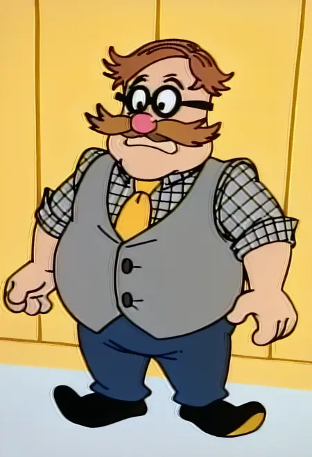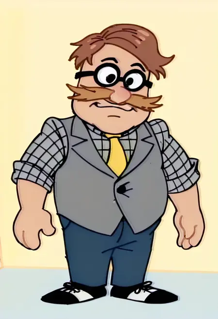 GarySML, 1boy, brown yarn hair, black glasses, brown mustache, gray vest, black-and-white checkered shirt, yellow necktie, pimples facial details, dark blue pants, black shoes,