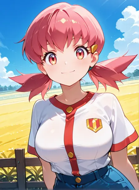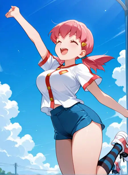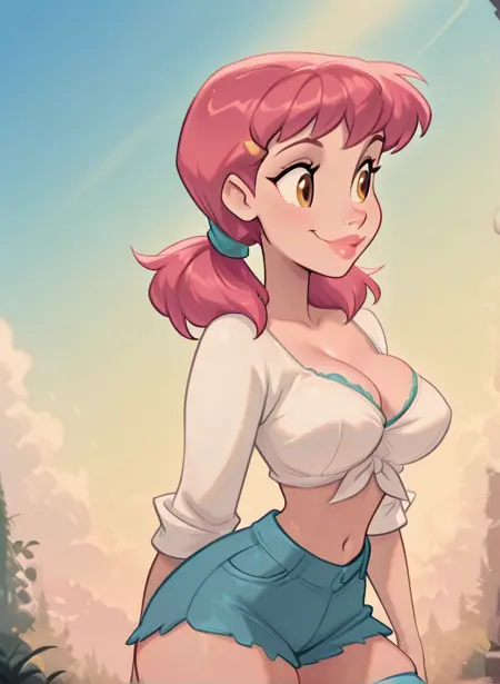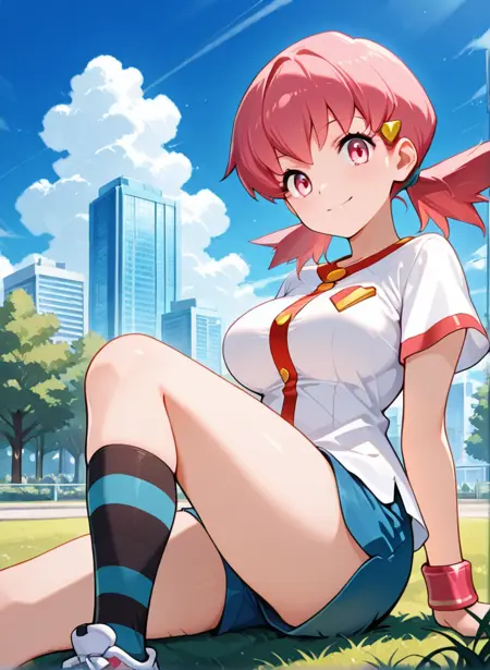 粉色头发、低双马尾、棕色眼睛、发饰、白色衬衫、蓝色短裤