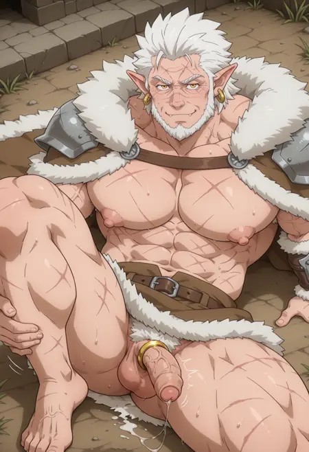 White hair, golden eyes, pointed ears, earrings, scar on face,