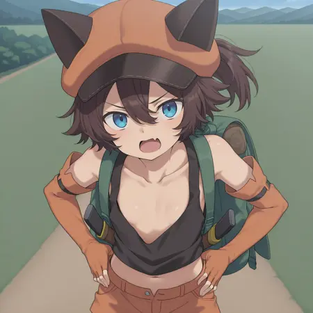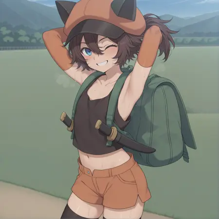복장: 녹색 모험가 백팩, 두루마리, 칼집, 검은 탱크탑, 주황색 손가락 없이 팔꿈치까지 덮는 장갑, 배꼽 노출, 주황색 단추 없는 반바지, 검은 허벅지 긴 양말, 갈색 부츠