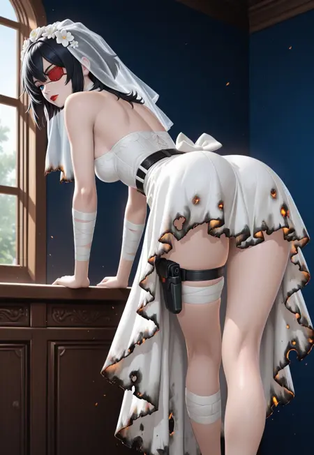 TheWidowF, black hair, long hair, blue eyes, eyepatch, red lips, breasts, bridal veil, flover, bare shoulders, wedding dress, white dress, burnt clothes, fire, belt, thigh holster, weapon, bandages, thighhighs, high heels,