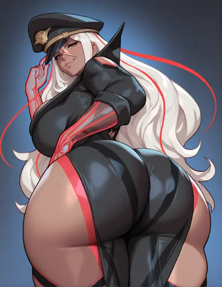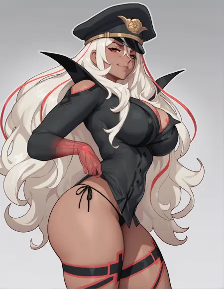 "tamadef, 뾰족한 모자, 군용 모자, 붉은 눈, 검은 피부 여자, 검은 피부, 줄무늬 머리카락, 눈 사이 머리카락, 붉은 머리카락, 몸 문신, 다색 머리카락, 투명한 몸, 큰 가슴, 검은 두건, 검은 드레스, 짧은 드레스"