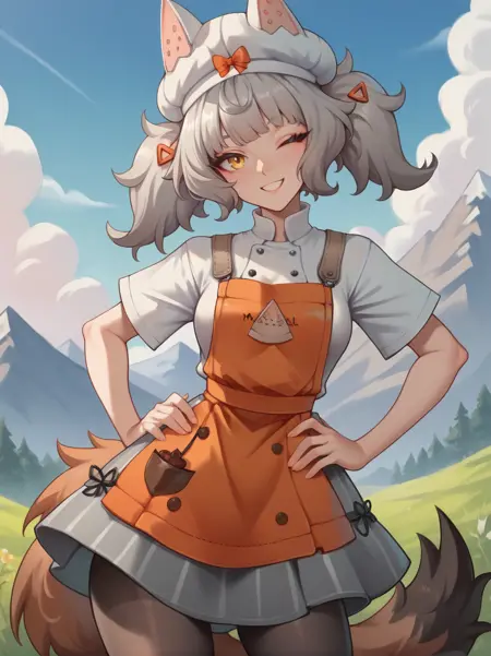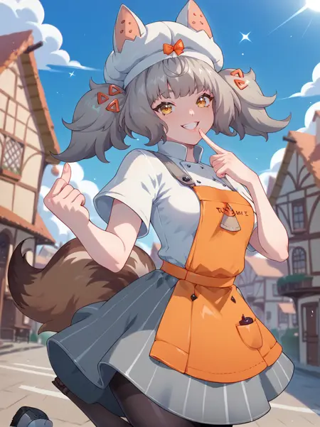 Outfit Prompts: "grey hair, yellow eyes, twintails, hair ornament, hat, single glove, white shirt, orange apron, pantyhose, grey skirt, animal ears, tail"