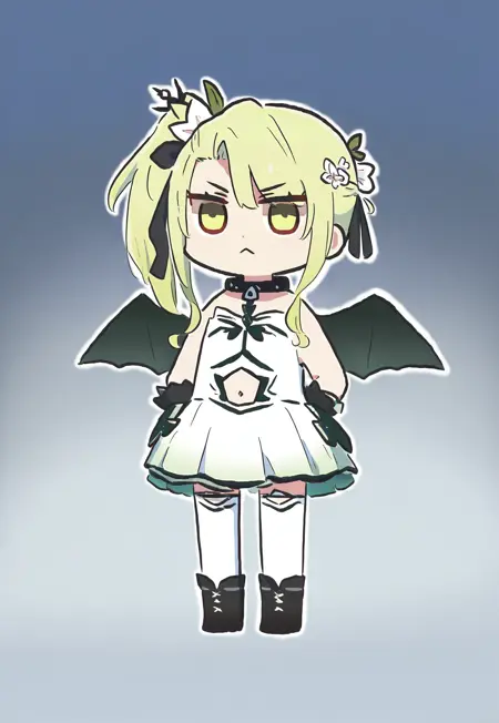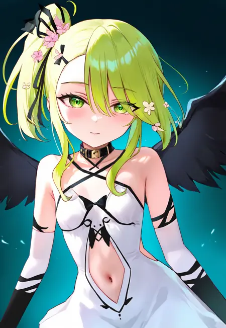 deathpolcaaps,hair flower,collar,white dress,navel cutout,fingerless gloves,white thighhighs,black boots,black wings