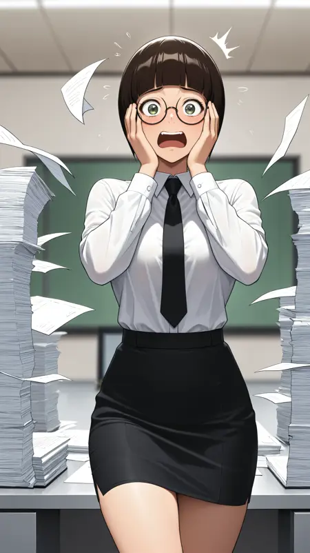 短发,深棕色头发,波波头,绿色眼睛,圆框眼镜,黑色西装,黑色领带,白色衬衫,