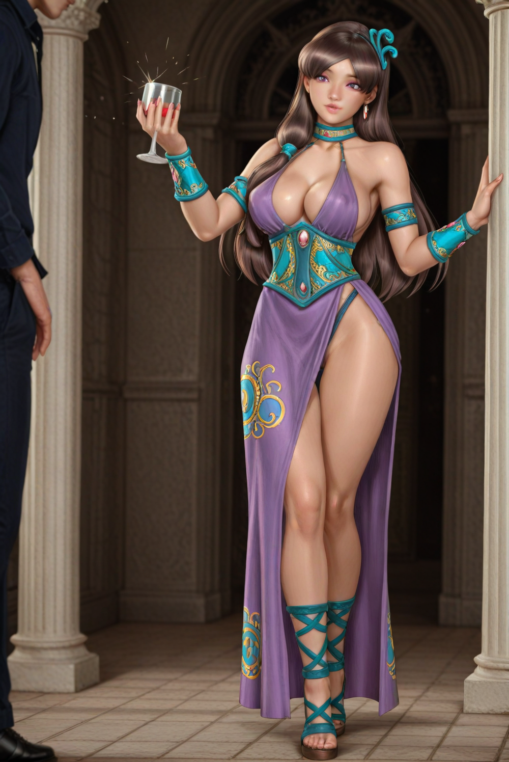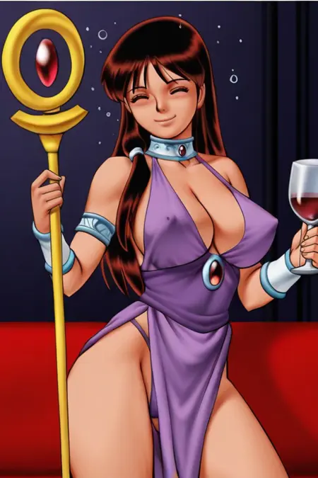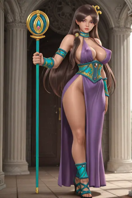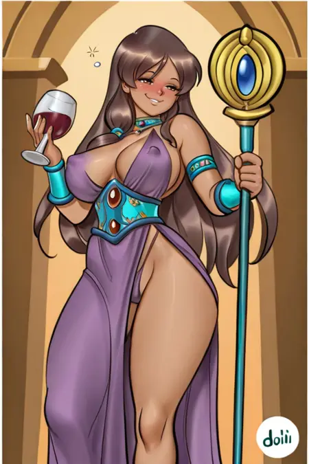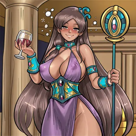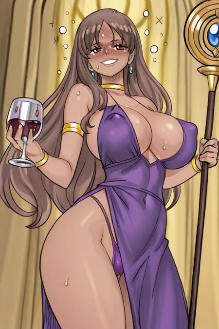 nike_hh_ill, nike_main, , breasts, long hair, large breasts, brown hair, dark skin, covered nipples, staff, dress, wine cup, drunk, smile, solo, purple thong, solo,