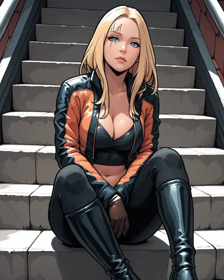 laylamiller, 长发, 金发, 蓝眼, 面部纹身, 夹克, 暴露胸部, 露脐装, 皮带, 裤子, 露腹, 手套,