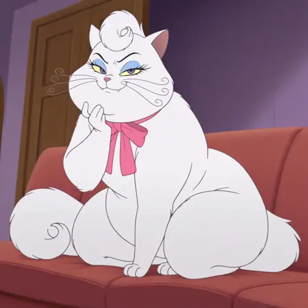 female, furry female, feral, solo, cat, short hair, white fur, blue eyelids, eyelashes, yellow sclera, purple eyes, pink nose, whiskers, sharp teeth, busy tail, paw pads, obese