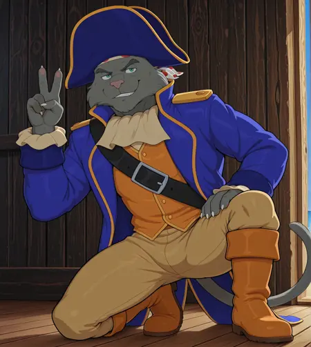 옷 프롬프트: "파란 코트, 부츠, 바지, 해적 모자"