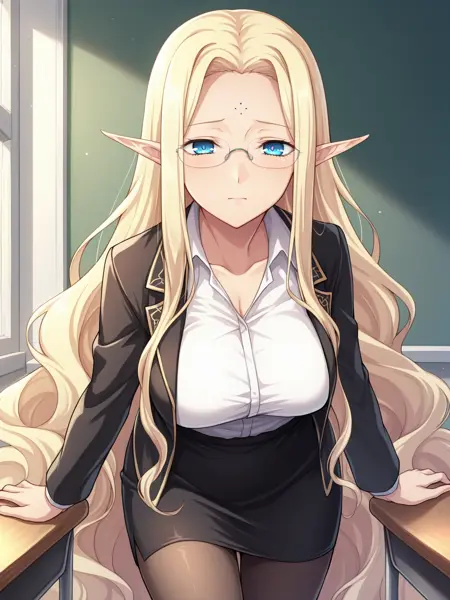 外观:Serarena,蓝色眼睛,非常长的头发,金色头发,尖耳朵,中等大小的胸部,成熟女性