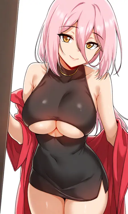 - god of bet \(seka\),bare shoulders,cleavage cutout,clothing cutout,hair between eyes,long hair,pink hair,underboob,underboob cutout,yellow eyes,black pencil skirt