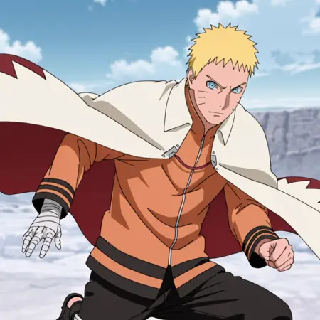 - ハタカケ衣装付きトリガー:NarutoBorutoHokage, blonde hair, uzumaki naruto, blue eyes, facial mark, whisker markings, cloak, long sleeves, pants, jacket, cape, cowboy shot