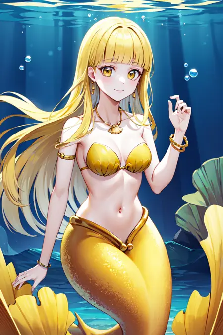 衣装2aacoco, long hair, blonde hair, blunt bangs, earrings, mermaid, armlet, yellow bikini, shell bikini, bikini top only, bracelet