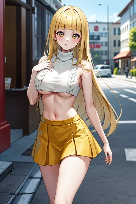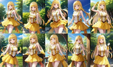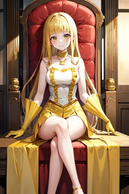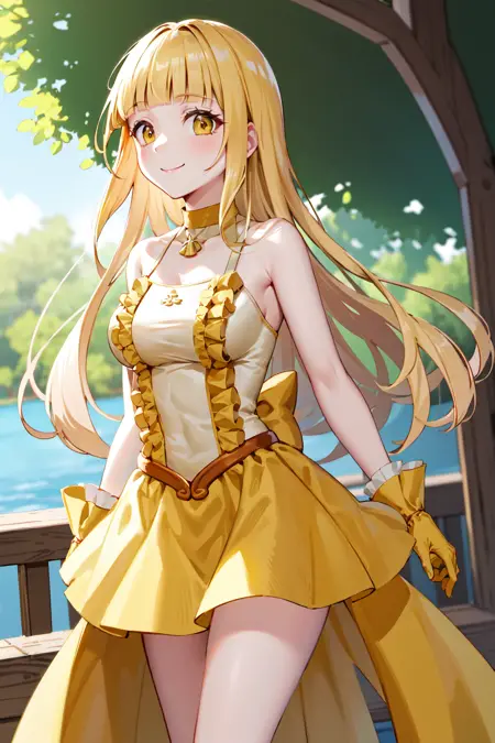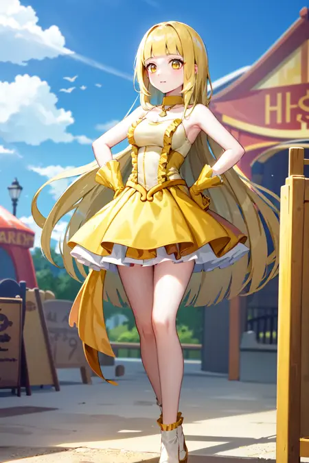 衣装1aacoco, long hair, blonde hair, blunt bangs, choker, frills, yellow dress, sleeveless, yellow gloves, yellow skirt