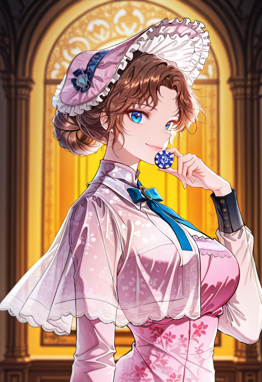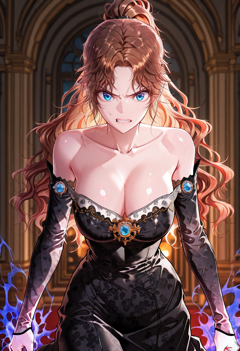 Sylvia Atlante, brown hair, long hair, parted bangs, blue eyes, shiny hair,