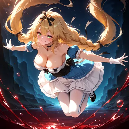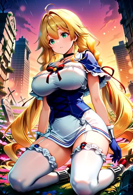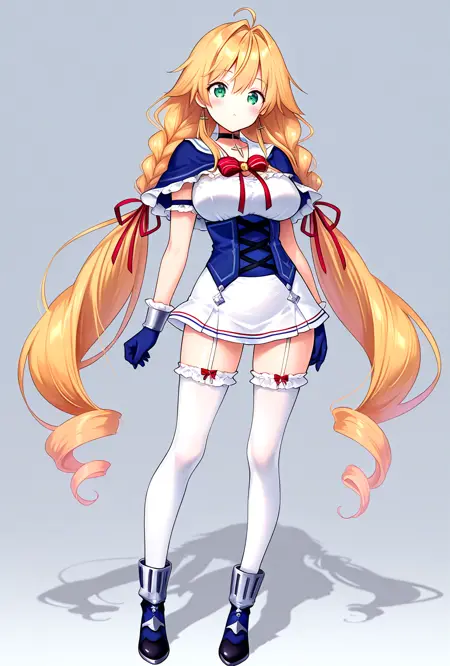 默认服装: deftem、金发、超长发、双马尾、绿眼睛、大胸、红色丝带、蓝色束腰、下胸线、交叉系带服饰、荷叶边小披肩、蓝色小披肩、黑色项圈、交叉项圈、蓝色手套、荷叶边手套、白色短裙、超短裙、吊袜带、白色过膝袜、荷叶边过膝袜、荷叶边、交叉耳环