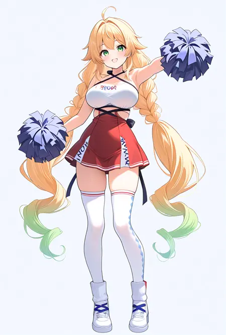加油之星服装: temcheering、金发、绿发、超长发、双马尾、绿眼睛、大胸、渐变发色、多彩发色、双辫子、红色裙子、高腰裙、侧边开叉、短上衣、白衬衫、无袖上衣、白色过膝袜、交叉吊带、吊颈式