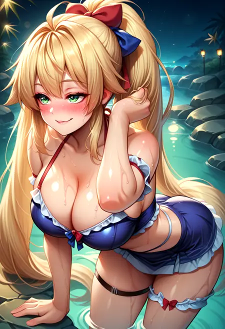 夏季服装: temsummer、金发、超长发、双马尾、高马尾、绿眼睛、大胸、荷叶边臂环、蓝色比基尼、吊颈式、红色蝴蝶结、双色蝴蝶结、蓝色蝴蝶结、发带、露脐、蓝色短裙、性感乳沟、内裤带、荷叶边比基尼、荷叶边、大腿绑带、条纹比基尼下装