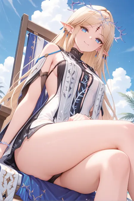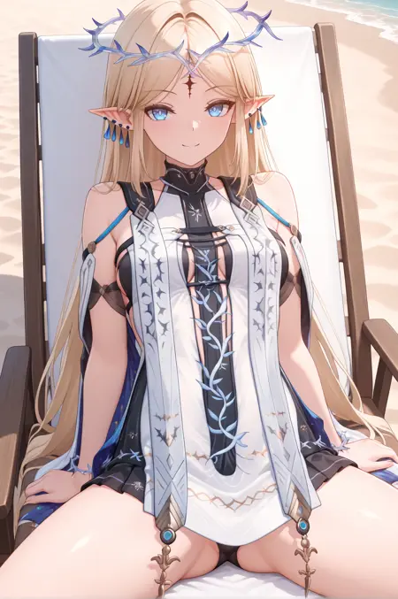 공식 복장: cartethyiarv2, 1girl, long hair, blonde hair, jewelry, bare shoulders, pointy ears, sidelocks, white tabard, tabard, stole, undersuit, blue earrings, multiple earrings, crown of thorns, earrings, parted bangs, bracelet, circlet, forehead mark, braid,
