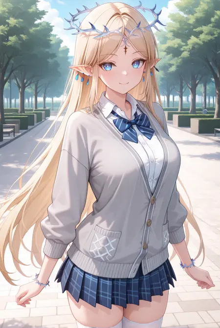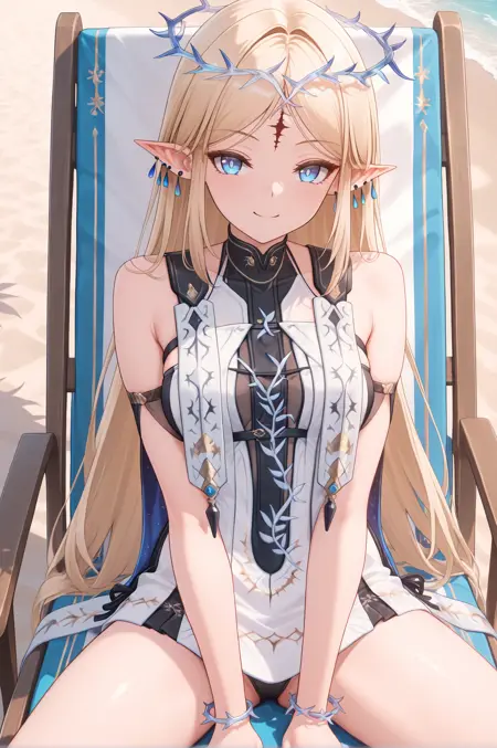 맞춤 복장: cartethyiarv2, 1girl, long hair, blonde hair, jewelry, pointy ears, sidelocks, blue earrings, multiple earrings, crown of thorns, earrings, parted bangs, bracelet, forehead mark,