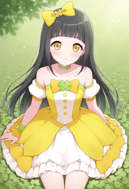프롬프트: tsumupri, 1girl, solo, 삼각형 모양의 동공, 클로버 브로치, 어깨 노출, 스트랩 없는 드레스, 헤어 리본, 손목 커프스, 노란 드레스, 긴 머리
