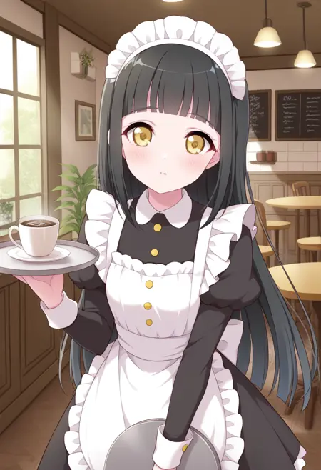 프롬프트: tsumugi, 검은 머리, 노란 눈, 헤어 리본, 둔한 앞머리, 어깨 노출, 녹색 목걸이, 노란 드레스, 긴 머리, 스트랩 없는 드레스