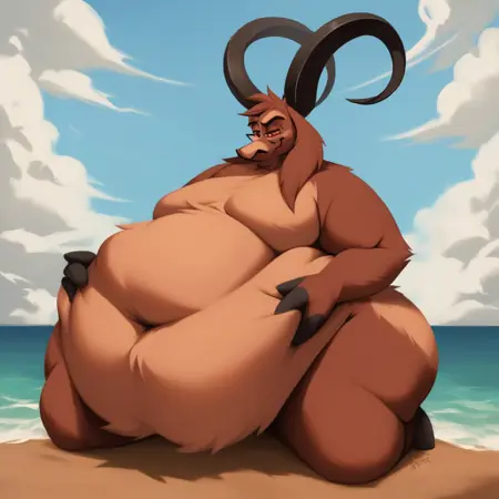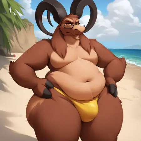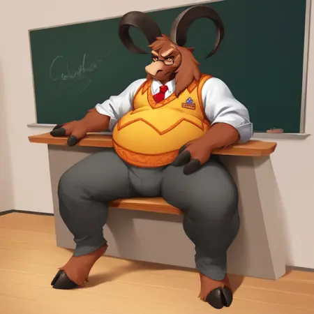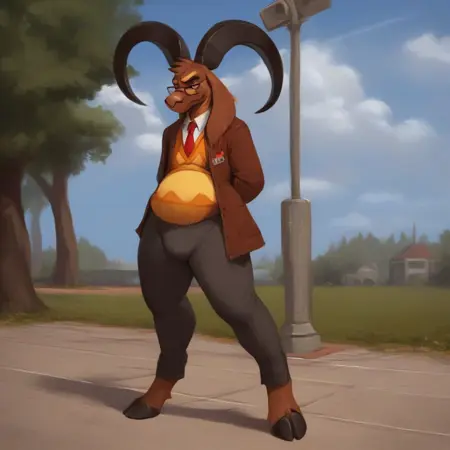 monbft, furry male, goat horns, goat ears, glasses, snout, body fur, brown fur, goat boy, two-tone fur, yellow sclera, black eyes, 3 fingers, grey fingers, white shirt, half-closed eyes, brown jacket, white shirt, red tie, grey pants, yellow sweater vest, frown, plump, long legs, tall male, long legs, open jacket, fat