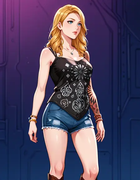 1girl, solo, shorts, tattoo, boots, blonde hair, jewelry, denim shorts, long hair, denim, blue eyes, bracelet, blue shorts, lips, kate denson
