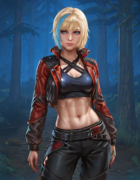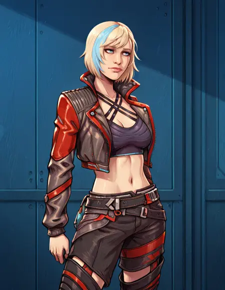 1girl, solo, navel, blonde hair, jacket, multicolored hair, pants, streaked hair, midriff, blue eyes, cropped jacket, short hair, shoes, belt, blue hair, criss-cross halter, open jacket, black pants, shorts, nea karlsson