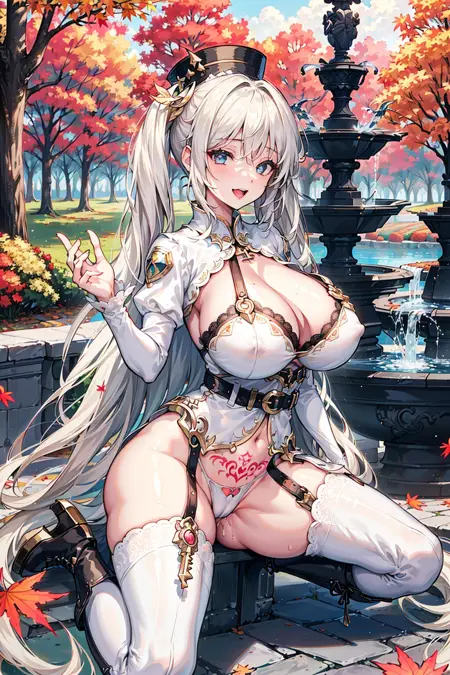 elefirNNTMDSLT, elefir hat, high heel boots, very long hair, twintails, white hair, frilled dress, belt, key,