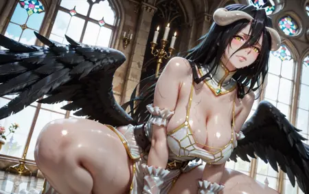 ilalbedo, 1girl, 가슴, albedo \(overlord\), 검은 날개, 솔로, 낮은 날개, 검은 머리, 허벅지, 긴 머리, 장갑, 악마의 뿔, 노랑색 눈, 흰 장갑, 보는 시선, 가슴 틈, 흰 뿔, 벌린 어깨, 드레스, 눈 사이의 머리카락, 큰 가슴, 뺨빨강, ahoge, 벨트, 분리된 칼라, 흰 드레스, 검은 깃털, CHURCH, <lora:illustrious- Succubus Albedo-1024X1024:1>, 다리 벌림
