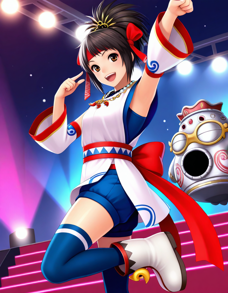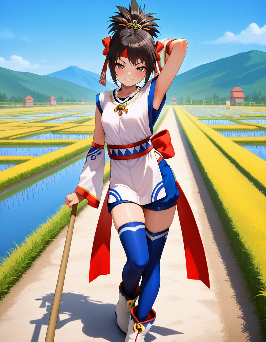 推奨プロンプト:1girl,solo, headband,ribbon, black hair,short hair, brown eyes,detached sleeves,shorts, blue thighhighs,ankle boots,necklace,sash、