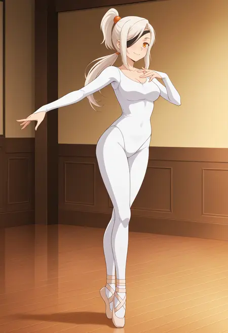 fuhu、白髪、高いポニーテール、オレンジ色のヘアバンド、オレンジ色の目、黒いアイパッチ