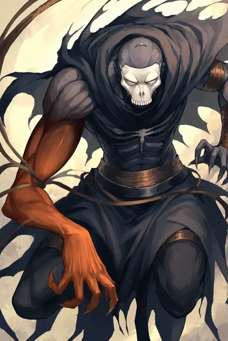 트리거 단어: 마스크, 암살자, 두개골 마스크, 붕대, 색상이 있는 피부, 검은 피부, 발톱, 짙은 피부, 검은 망토