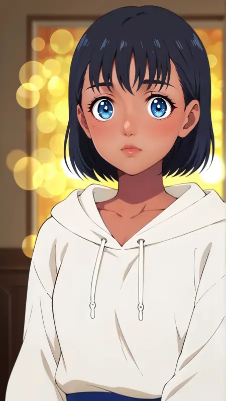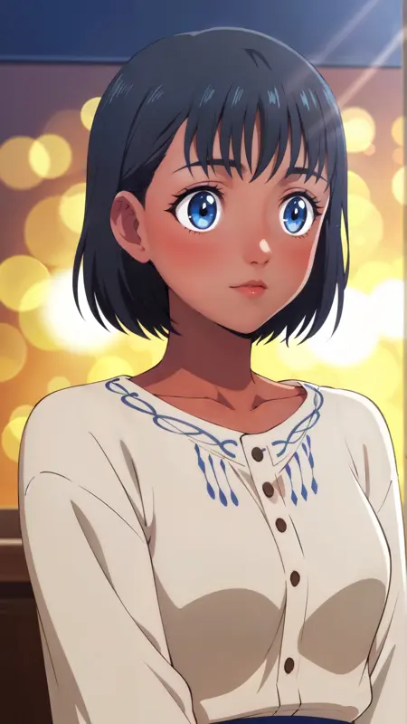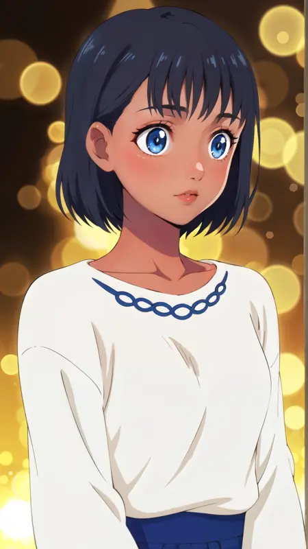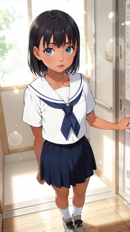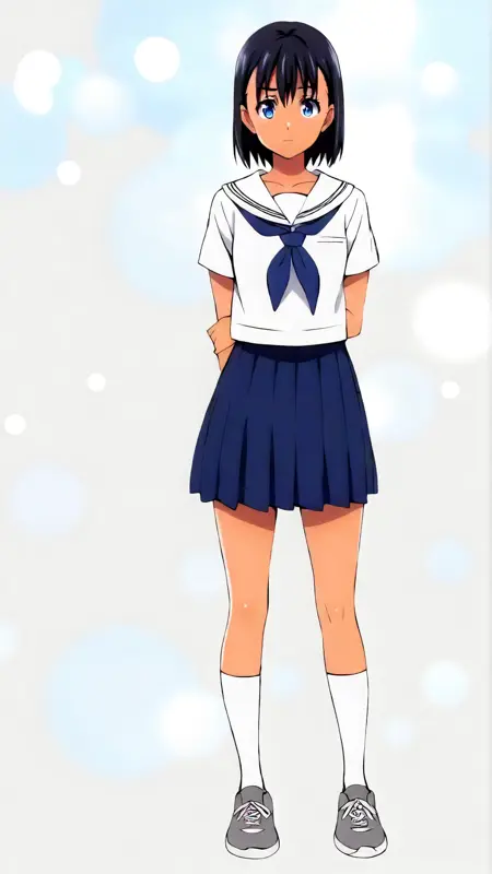 推奨プロンプト: "mio_kofune, an anime girl, 1girl, solo, looking at viewer, short hair, bangs, blue eyes, skirt, shirt, black hair, closed mouth, school uniform, standing, collarbone, full body, white shirt, short sleeves, pleated skirt, shoes, serafuku, socks, dark skin, sailor collar, dark-skinned female, blue skirt, neckerchief, kneehighs, tan, white socks, sneakers, white sailor collar, blue neckerchief, grey footwear"