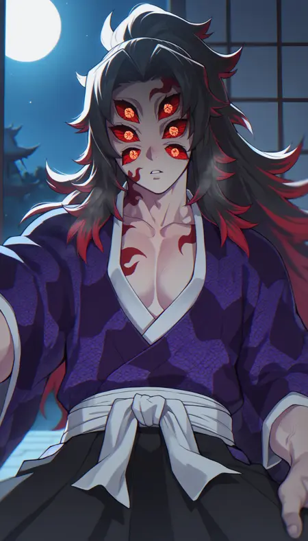 1boy, male focus, kokushibo, facial mark, extra eyes, red sclera, yellow eyes, ponytail, black hair, multicolored hair,
