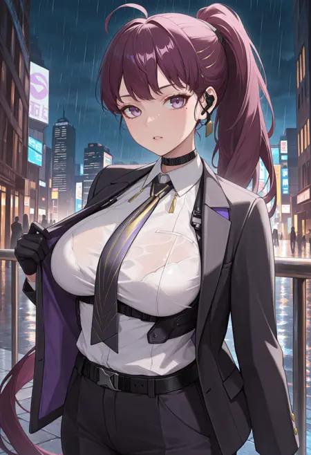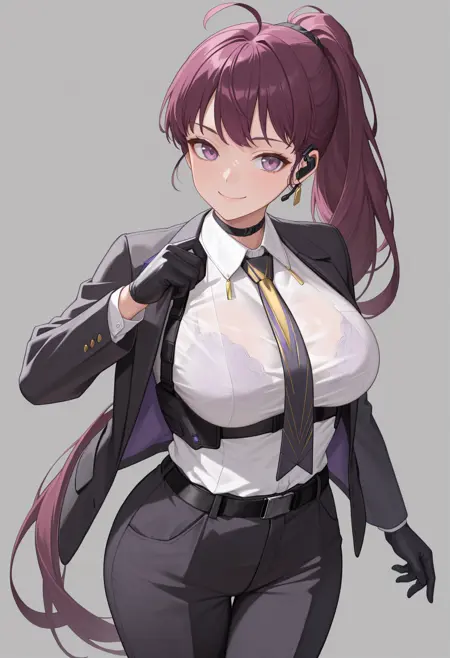 dlldf, 보라색 눈, 보라색 머리카락, 매우 긴 머리카락, 토끼꼬리, ahoge, 큰 가슴, 이어피스, 보석, 검은 목걸이, 넥타이, 흰 셔츠, 정장, 검은 재킷, 검은 바지, 검은 벨트, 검은 장갑, 옷 안에서 브라가 보임, 하네스, 눈 밑 점