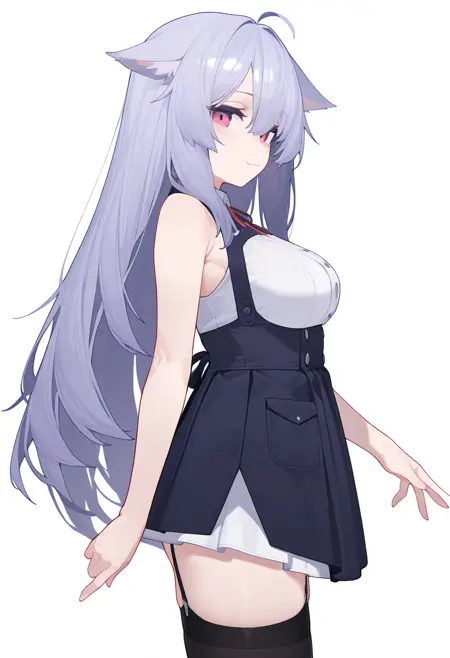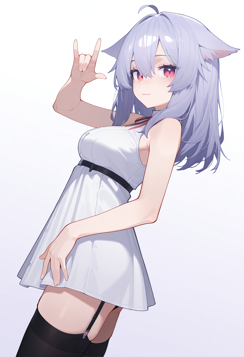 늑대 귀, 창백한 보라색 머리카락, 분홍색 눈, 긴 머리(또는 중간 길이 머리)