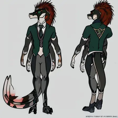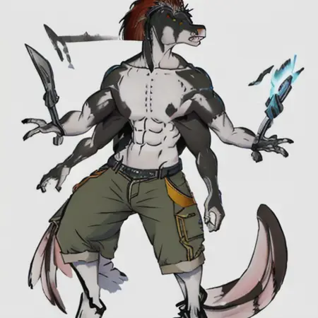 raharr, 4 arms,4 eyes, 3 fingers, 3 toes, toe claws, pseudo hairs,counter-shade body,thick tail,tail fin,