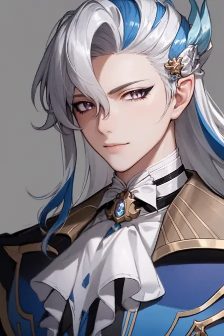 기타 프롬프트: 1boy, long hair, blue hair, white hair, multicolored hair, hair between eyes, pointy ears, hair ornament