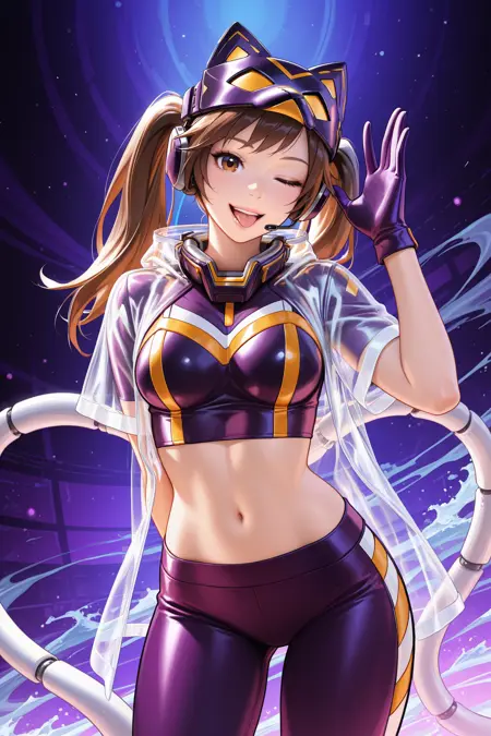 i:p_masquerena, official_outfit, 1girl, solo, 長い髪, 茶色の髪, ファーストハイソックス, グローブ, おへそ, 目の間の髪, 紫色の目, 中くらいの胸, 口を閉じた状態, 立ち姿, 全身, ツインテール, 短い袖, 紫色のグローブ, 腹部, 透けたジャケット, 偽の動物の耳, 多色のズボン, 動物の耳付きヘッドフォン, スケート, ローラースケート, 白い觸手, 機械的な觸手, インラインスケート, 多色のシャツ, 猫のマスク