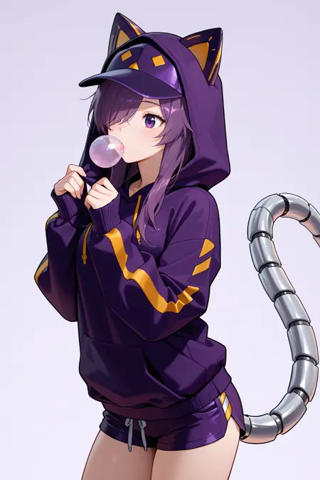 i:p_masquerena, extra_outfit, 1girl, solo, 長い髪, 視聴者を見つめる, 笑顔, 口を開けた状態, 長い袖, 動物の耳, 目の間の髪, 立ち姿, 紫色の目, 銀色の機械的な尾, 全身, 紫色の髪, ショートパンツ, 手を挙げている, 猫の尾, 短めのショートパンツ, 紫色のショートパンツ, フードをかぶっている, 手をポケットに入れている, 動物のフード, 猫のフード, 紫色のフーディ, 紫色の野球帽, 二色の靴
