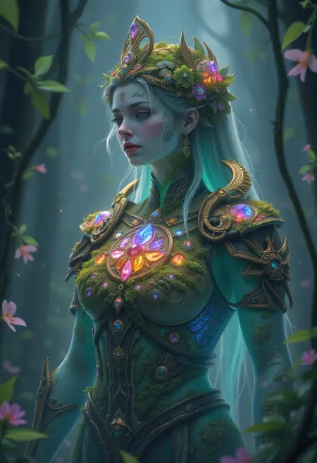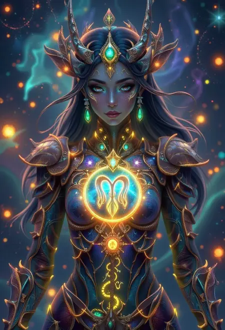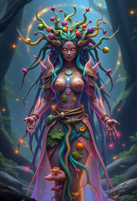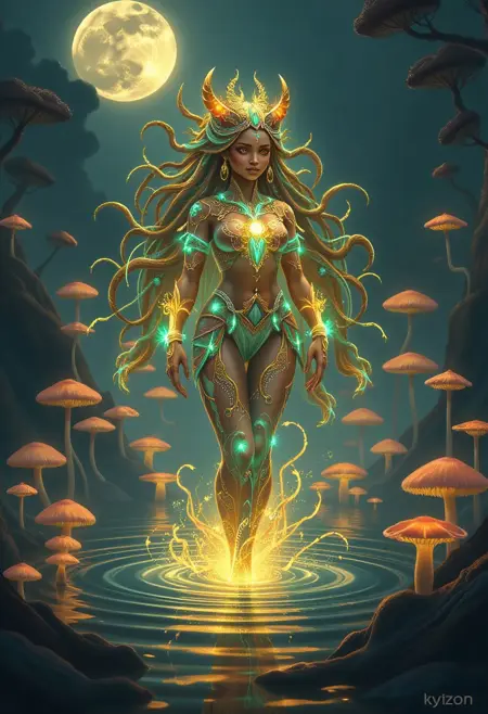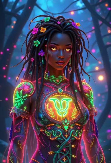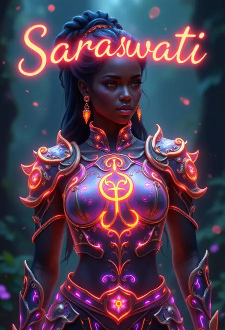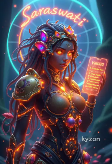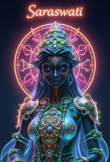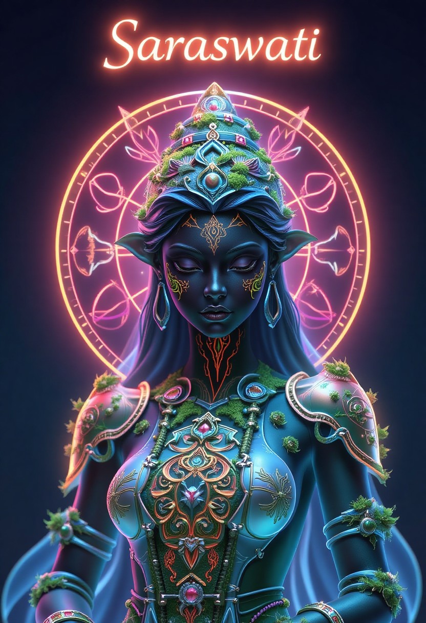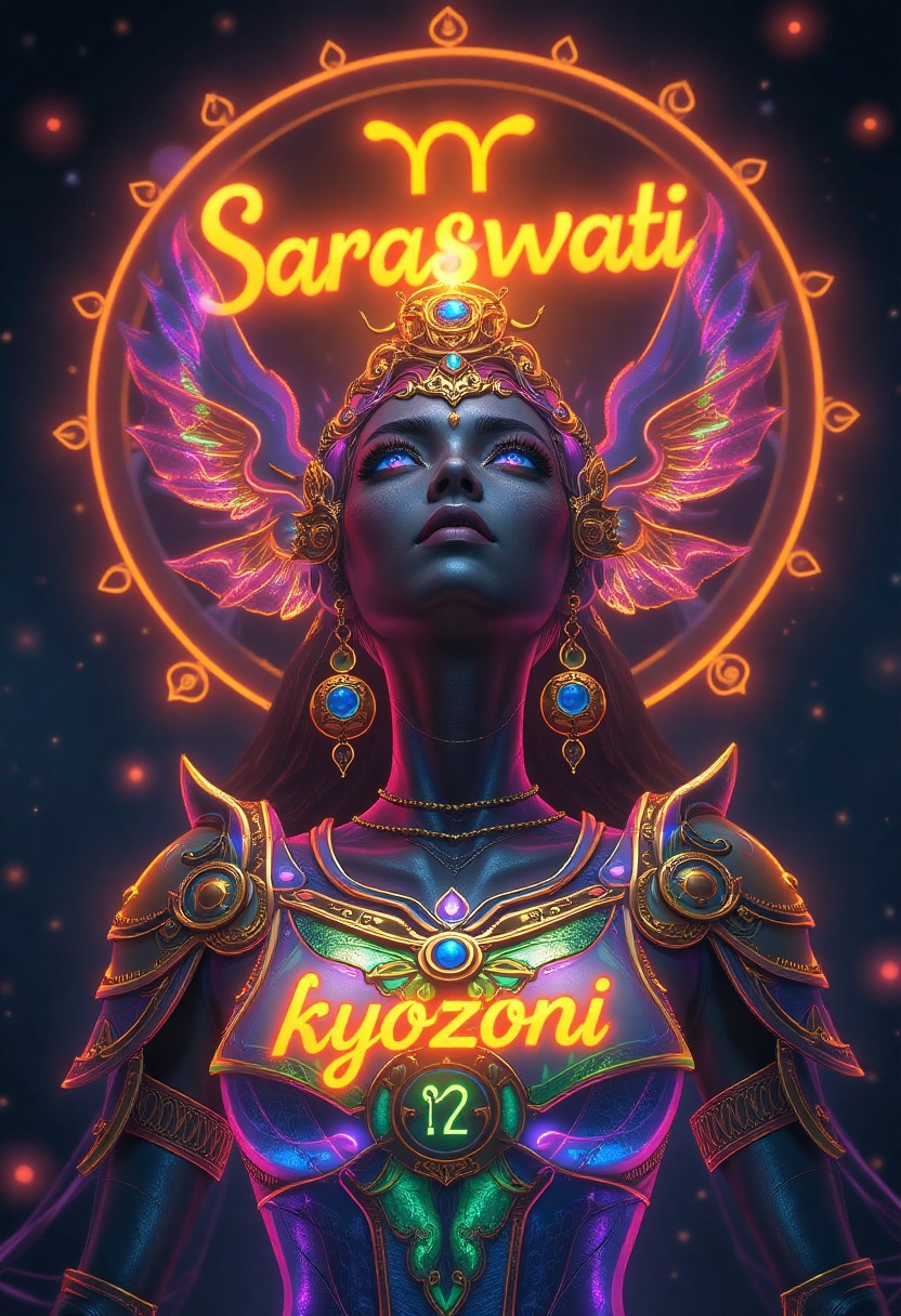 她身披着生物发光的透明真菌、苔藓和海藻的空灵优雅。她的身体装饰着一套精雕细琢的生物发光透明处女座亚历山大石星座铠甲,散发出迷人的光芒,勾勒出她的身形。位于胸甲中央的处女座符号,以鲜艳的霓虹色彩脉动,象征着她与宇宙及其智慧的深刻联系。她的头发如同生物发光的透明根须、藤蔓、果实茎干和木质 dreadlocks。她头顶上方,以宏伟的霓虹字母浮现出她的名字“Saraswati”,为整个场景投射出超凡脱俗的光辉。画面底部以霓虹色镌刻着“kyōzon”一词,暗指日语中“幻觉”的含义,暗示她存在所蕴含的超现实与奇幻特质。她的人物面板展示了50种独特而逼真的真菌系超能力,为她神秘的气质增添了深度与吸引力。阴郁的背景与鲜明的霓虹元素形成对比,突显她为构图的焦点。色彩、纹理与形态的视觉交响共同营造出一幅引人入胜的画面,呈现一个既属于此世、又超越此世的强大力量。