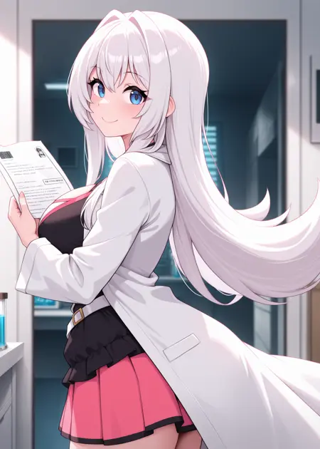 흰 실험복, 짧은 검은 드레스, 분홍 치마, 주름 치마, 검은 부츠