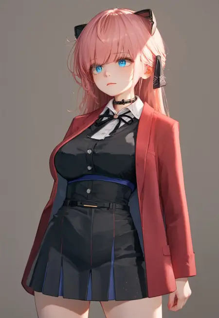 Trigger: Vivi, pink hair, blue eyes, large breasts, choker, hair ribbon, red jacket, black belt, short skirt, bangs