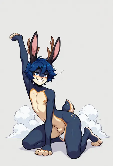 jack, arwe, jackalope, 1boy, male, solo, furry, fluffy hair, blue hair, blue eyes, big eyes, short hair, animal ears, bunny ears, deer ears, deer antlers, antlers, animal nose, snout, golden spots, golden details, golden accents, body fur, tail, rabbit tail, paws, smile, teeth, navel, golden nipples, golden to pink dick,