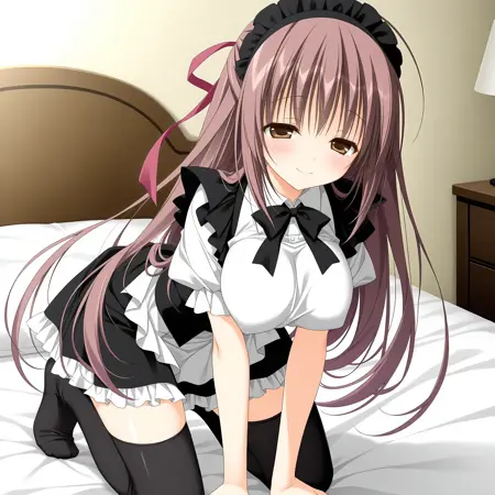 메이드, 메이드 헤어 액세서리, 검정 허벅지 스타킹, 검정 치마, 프릴 치마, 흰 프릴, 반팔, 검정 리본넥타이, 검정 프릴,