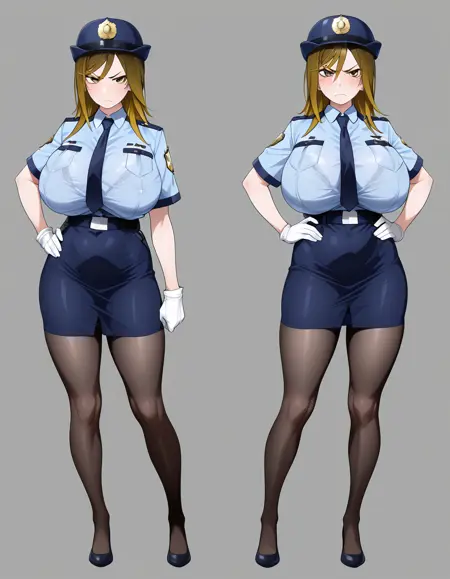 Positive: date makiko, female police uniform, annoyed, huge breasts, looking at viewer, simple background