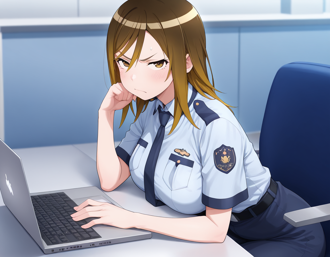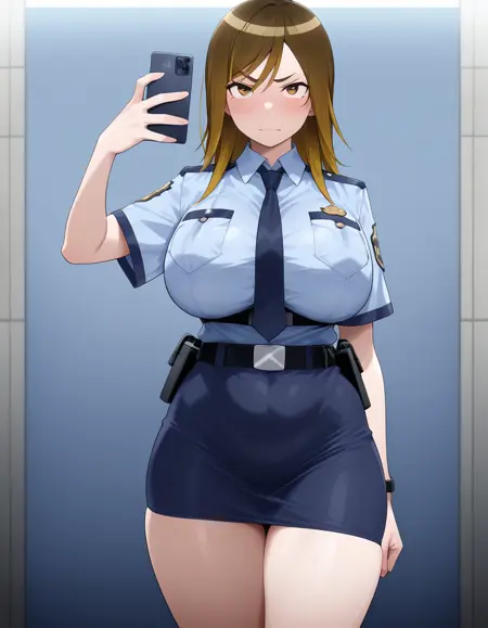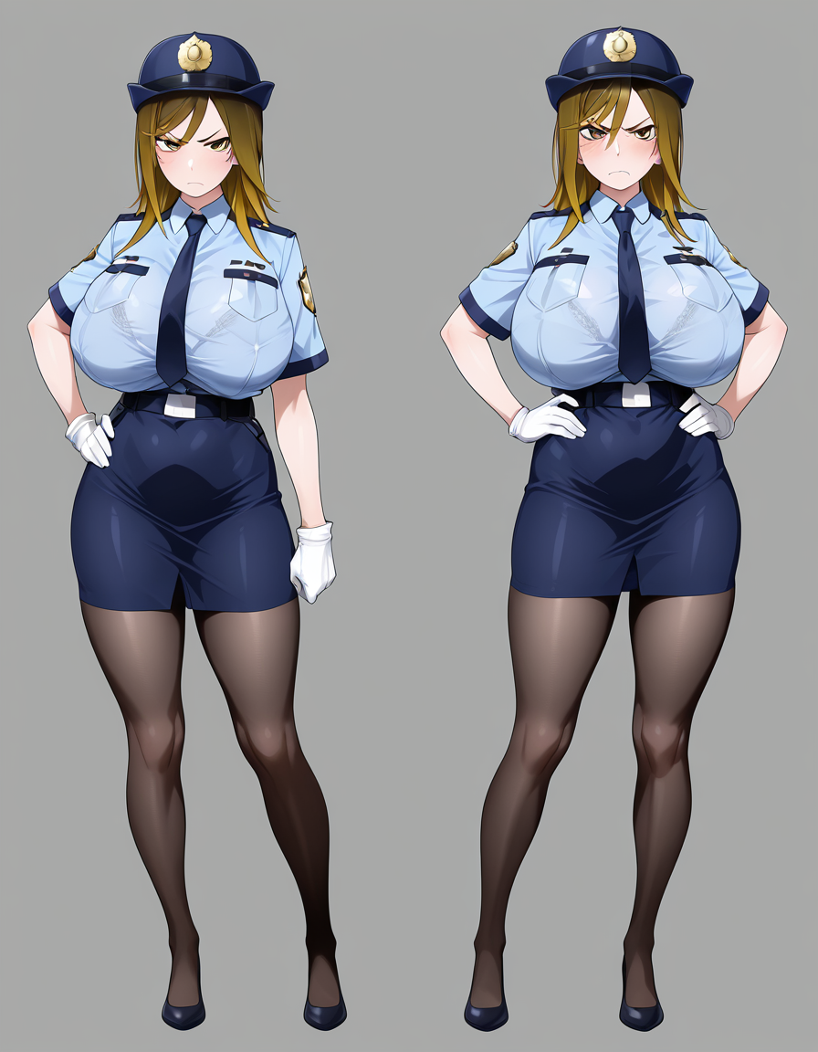 ポジティブ:date makiko、女性警察官の制服、イライラしている、巨乳、視線を観客に向けている、シンプルな背景